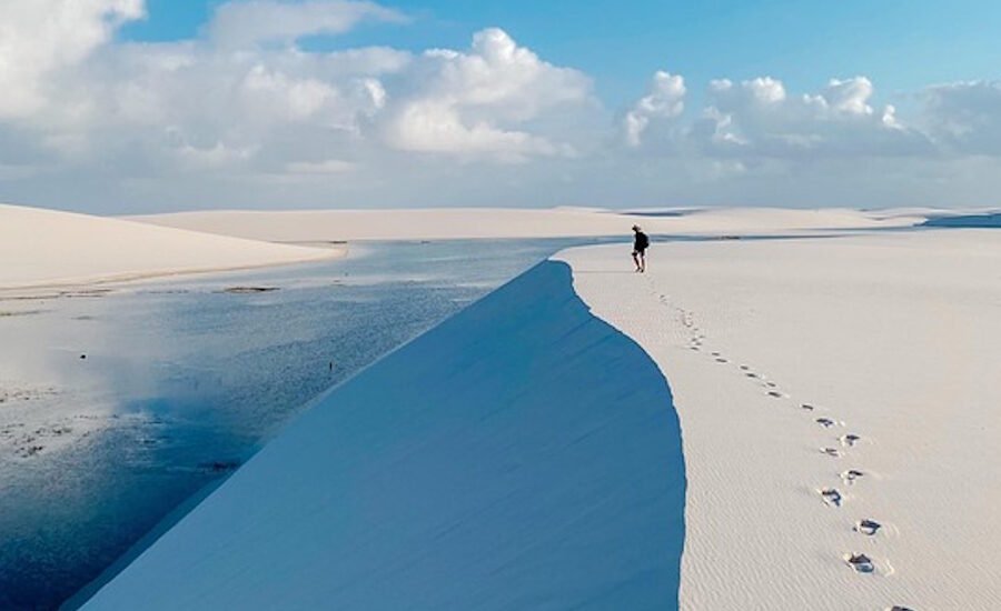 Lençóis Maranhenses National Park in Maranhão, Brazil, is a landscape of pure paradox. Covering over 1,500 km², it looks like a desert of rolling white dunes, yet for half the year, it bursts into life with turquoise and emerald lagoons. Heavy tropical rains, carried by the Intertropical Convergence Zone, transform valleys between dunes into thousands of freshwater pools. From the air, the dunes resemble giant white bedsheets spread across the land—hence the name Lençóis, Portuguese for “sheets.” Locals say it is the only desert in the world where the sand swims.